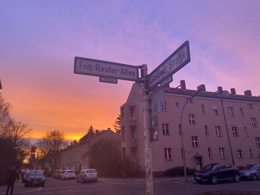 Coming up out of the U-Bahn station into purple morning light, the wind rushes past me as another train comes into the station. I’m slowly getting used to stereo input and getting my brain to match up the different versions of sound on each side. I can tell the direction that some of the cars are coming from.