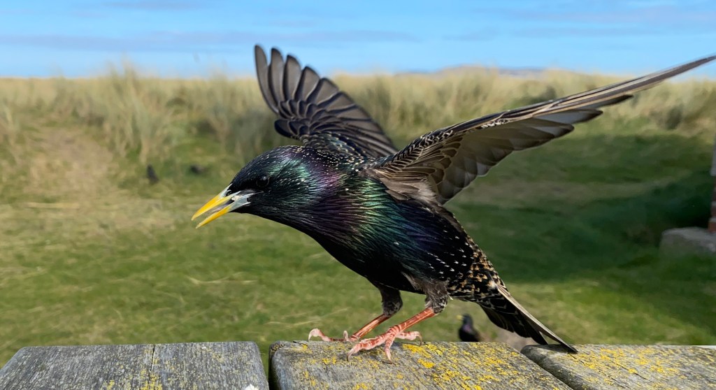 I’ve worked up a hunger and get lunch at Happy Out. An iridescent starling lands beside me. A professional groker, coveting my food. His clicking noises, whistles, chirps and mimicking of diving bombs and small dogs barking are in clear stereo and the direction of the noise from the other starlings around me is clear. I think a chattering of starlings is the right collective noun for this situation- they don’t have the numbers or altitude to constitute a murmuration. Starlings are professional mimics- Mozart kept a pet starling, it was either the inspiration for Piano Concerto No 17 or it learned motifs from it (singing two notes sharp). The starling died around the same time that a young prodigy called Beethoven came to visit Mozart in 1787. Starlings can mimic speech too. Their mimickery sounds like an approximation of what I hear through the CI. As they mimic words and phrases that they have been exposed to, their diminutive anatomy obviously leads to a degree of pitch shifting. Listen for yourself here. I’ll work on my Garage Band skills and make a mock up of what I hear at some point- this is one advantage of giving CIs to people with single-sided deafness- we can tell people what it sound like.