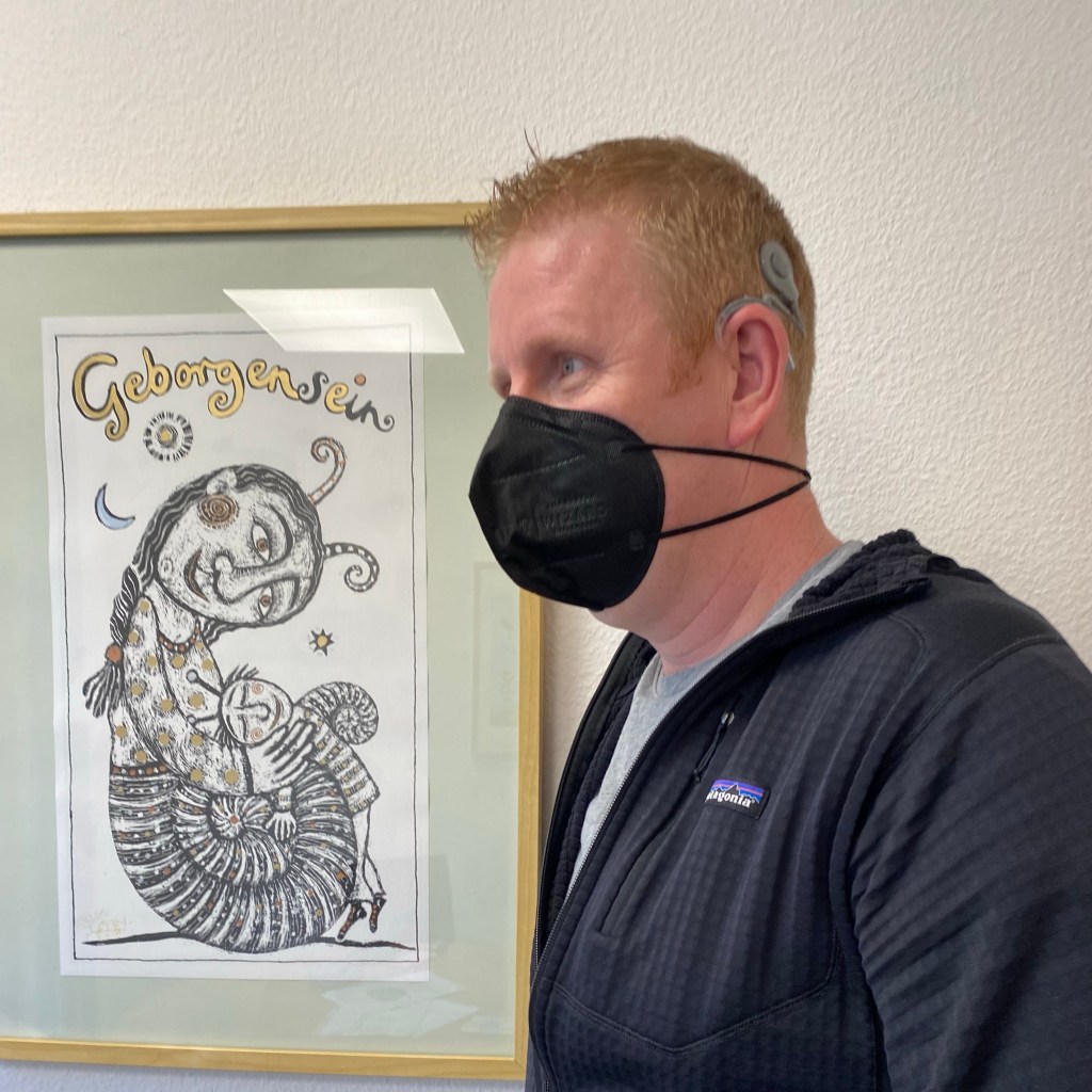 Part of today’s session was a hearing test with a speaker rather than the usual headphones. With an ear plug and a noise cancelling ear defender on my right ear, it drove home the importance of the CI as insurance against any future hearing problems in my good ear. I was hearing tones down around 20dB (compared to around 95-105dB without the CI). I got 60% on a word recognition test with German numbers. She was nice to me saying that the ones that I got wrong were still half right. I struggled a little with the German reversed word order and found myself counting up ein, zwei, drei, vier, fünf, sechs, sieben, acht, neun and stopping at the one that matched what I had heard.