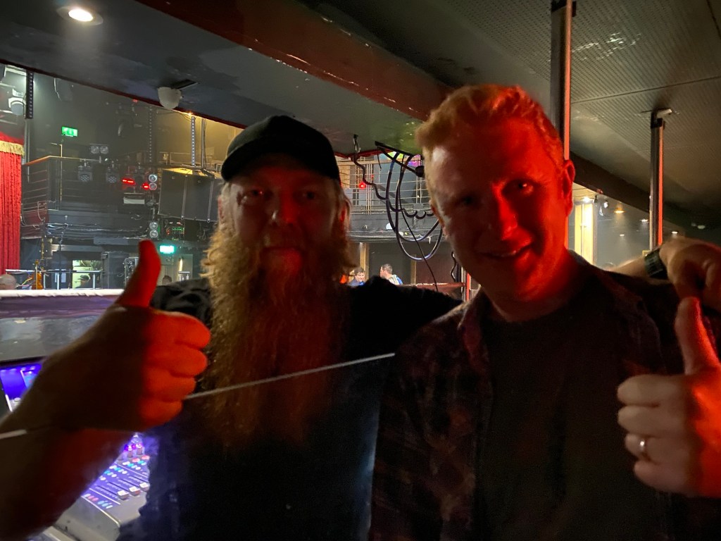 We’re beside the wheelchair accessibility area at the gig. This takes the format of a small platform that the person in a wheelchair is on. They raise the platform to a comfortable height and have no problem seeing over the people in front of them. This looks like a venue that takes accessibility seriously. As we talk to the engineer afterwards he’s thinking on his feet about how our approach can be scaled up to help more people with hearing loss.